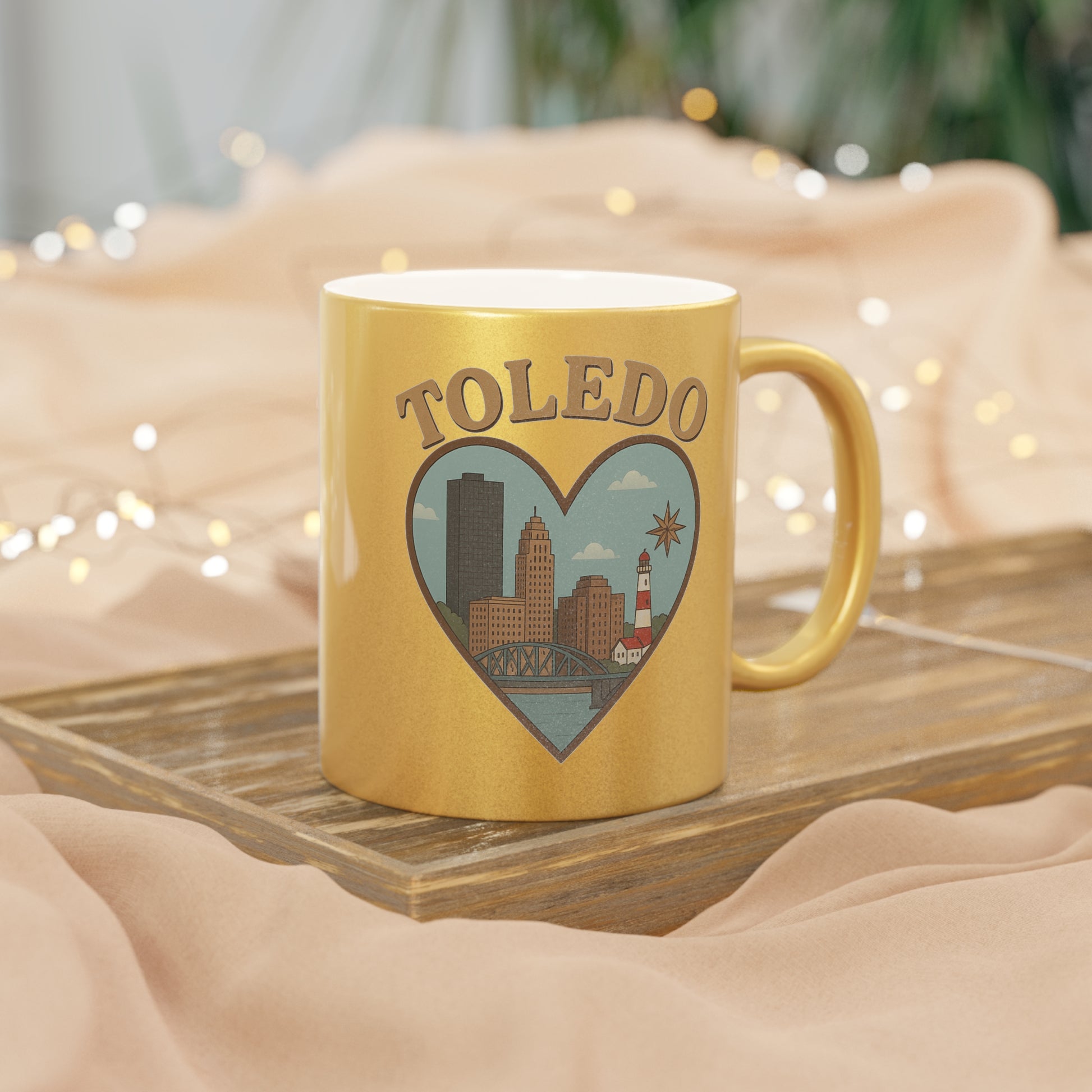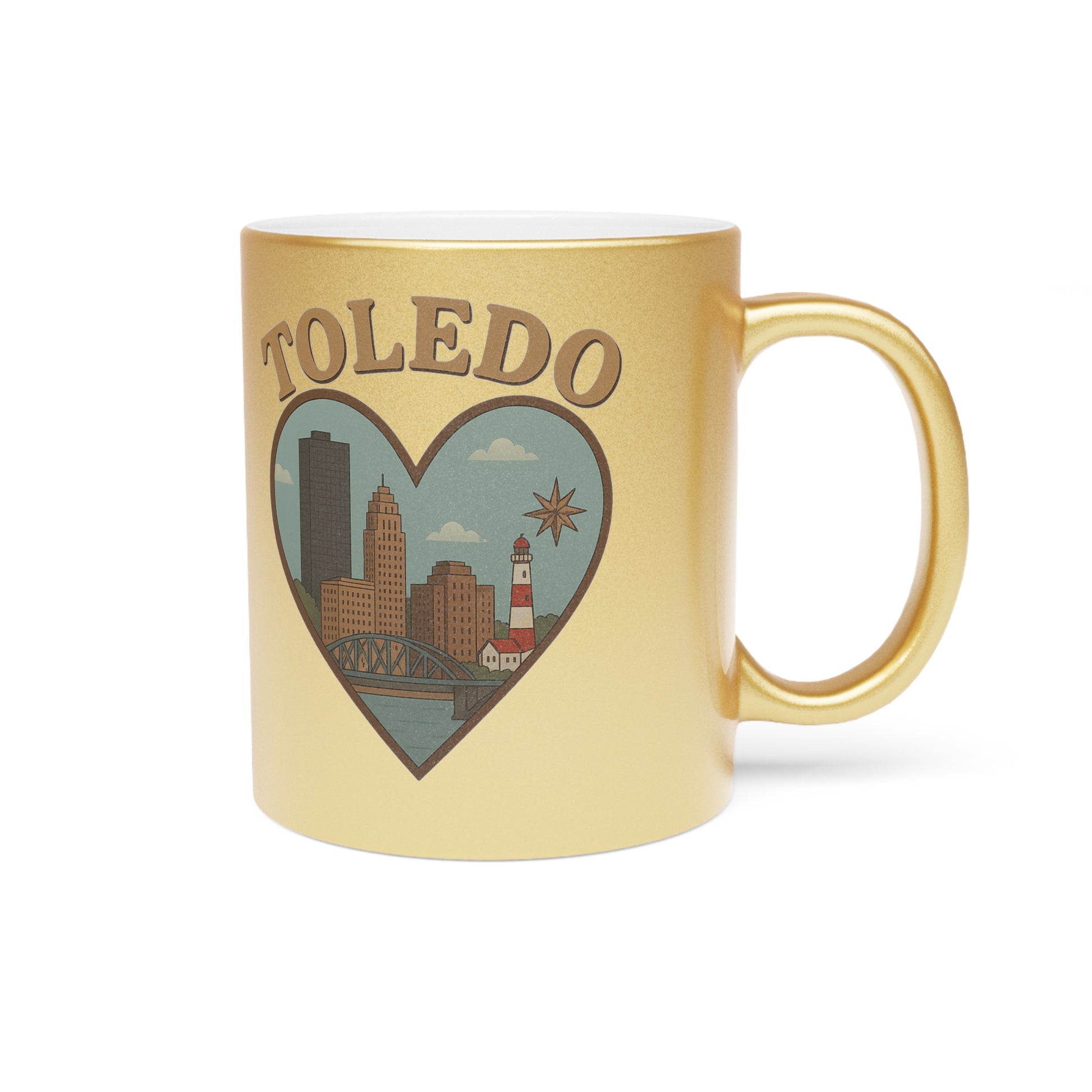 Toledo Skyline Metallic Mug - Bold Vintage Heart Design in Silver Gold